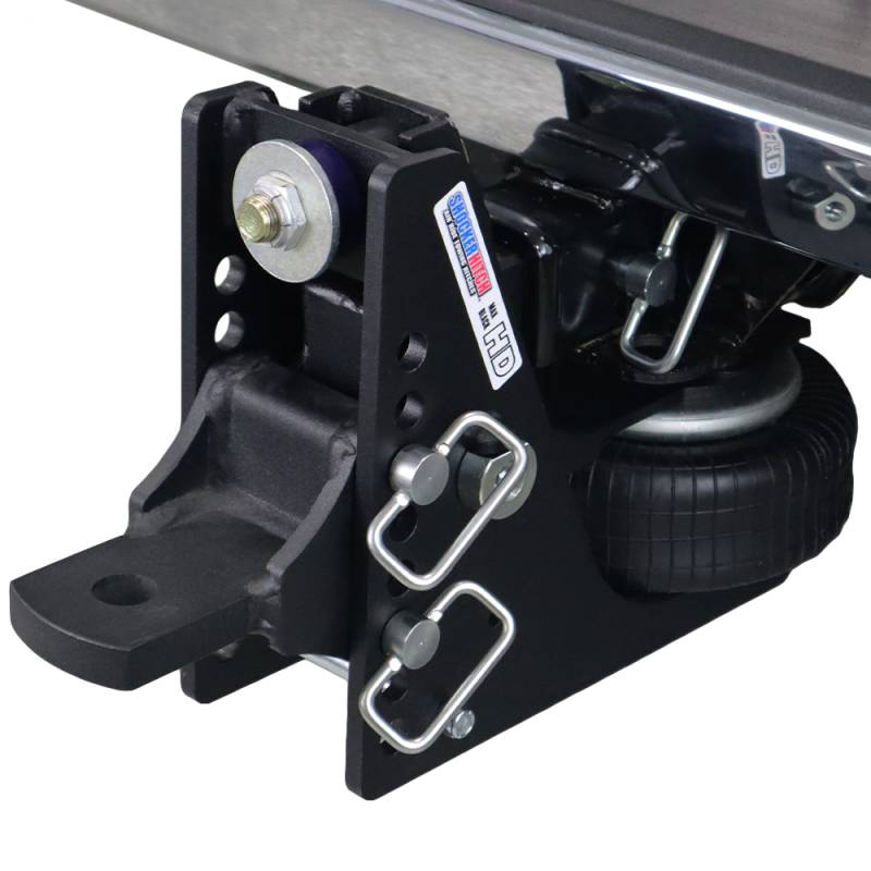 The Shocker HD Max Black air bumper drawbar hitch comes with 1" hole for quick hookup on the wagons and carts around the farm. The built in air suspension system filters the bumps, bags, jerks and tugs giving you with a safer and smoother trailer towing whether you are on or off the road. The shock absorbing design makes starts, stops and driving across the field or into town easier on you, your trailer, tow rig and contents. The adjustable drawbar kitted with the max black HD air hitch offers 1/2" to 4-1/2" of drop and is built heavy duty with a 20,000 lbs GTW capacity. The HD Max Black Air drawbar hitch is commonly used on pickup trucks, utv’s, atv’s, gators, tractors, toolcats and more. Ideal use is for hay wagons, anhydrous tanks, wagons, carts, augers, bailers, spreaders, sprayers, cultivators and farm equipment. Max Black HD air hitch features a premium grade, impact-resistant textured matte black finish. Shocker Hitch Max Black air provides the ultimate smooth ride. This shocker absorbing hitch is an air suspension unit mounted between your pickup truck and trailer. The built-in air ride system cushions the ride and absorbs the road shock creating a smoother and safer towing experience. This Shocker air receiver hitch fits into a standard receiver hitch tube. The air suspension system sits under the receiver tube allowing a short distance of 10-inches between the mounting pin and ball center. You will find the advantage of the Air Shocker is your ability to adjust air pressure for the best ride and load control. Available for 2", 2 1/2" and 3" receiver hitches.
