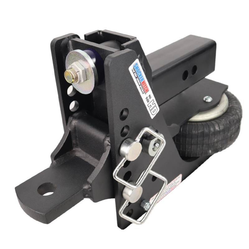 The Shocker HD Max Black air bumper drawbar hitch comes with 1" hole for quick hookup on the wagons and carts around the farm. The built in air suspension system filters the bumps, bags, jerks and tugs giving you with a safer and smoother trailer towing whether you are on or off the road. The shock absorbing design makes starts, stops and driving across the field or into town easier on you, your trailer, tow rig and contents. The adjustable drawbar kitted with the max black HD air hitch offers 1/2" to 4-1/2" of drop and is built heavy duty with a 20,000 lbs GTW capacity. The HD Max Black Air drawbar hitch is commonly used on pickup trucks, utv’s, atv’s, gators, tractors, toolcats and more. Ideal use is for hay wagons, anhydrous tanks, wagons, carts, augers, bailers, spreaders, sprayers, cultivators and farm equipment. Max Black HD air hitch features a premium grade, impact-resistant textured matte black finish. Shocker Hitch Max Black air provides the ultimate smooth ride. This shocker absorbing hitch is an air suspension unit mounted between your pickup truck and trailer. The built-in air ride system cushions the ride and absorbs the road shock creating a smoother and safer towing experience. This Shocker air receiver hitch fits into a standard receiver hitch tube. The air suspension system sits under the receiver tube allowing a short distance of 10-inches between the mounting pin and ball center. You will find the advantage of the Air Shocker is your ability to adjust air pressure for the best ride and load control. Available for 2", 2 1/2" and 3" receiver hitches.