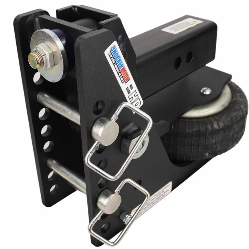 - Kit includes complete Shocker HD max black air receiver hitch with built in HD air ride system & dual bump cushions, adjustable drawbar and three d-handle mount attachment pins with clips.