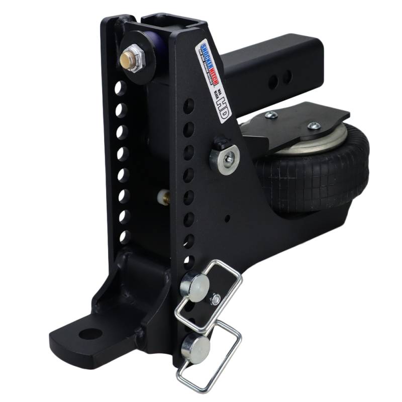 - Complete Super Drop Air Ride Hitch Kit Includes: Shocker HD Max Black Super Drop air receiver hitch with built-in 20K air ride system & dual bump cushions, drawbar with 1" hole & 3 d-handle mount attachment pins with clips.