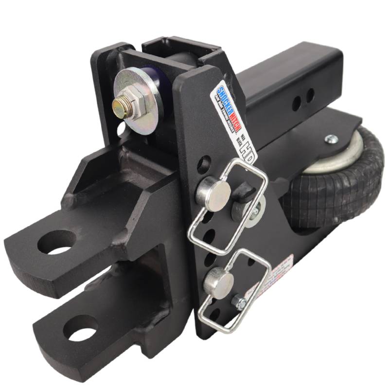 - Kit includes complete Shocker HD air receiver hitch base frame assembly with built in 20K air ride system & dual bump cushions, clevis pin mount and three d-handle ball mount attachment pins with clips.