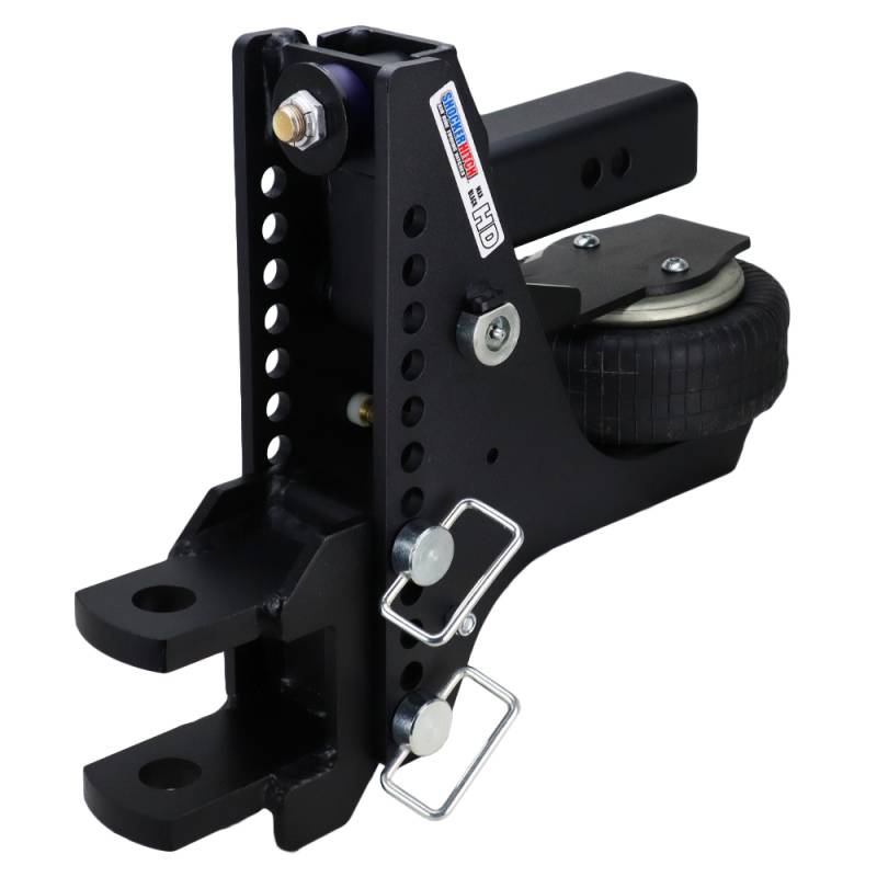 - Complete Super Drop Air Ride Hitch Kit Includes: Shocker HD Max Black Super Drop air receiver hitch with built-in 20K air ride system & dual bump cushions, clevis mount with 1-1/4" holes & d-handle mount attachment pins with clips.