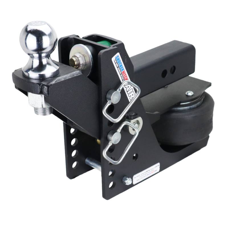 - Kit Includes: Shocker Max Black 12K air receiver hitch with built-in 12K air ride system & dual bump cushions, adjustable raised ball mount with 2" or 2-5/16" chrome hitch ball & three d-handle ball mount hitch pins.