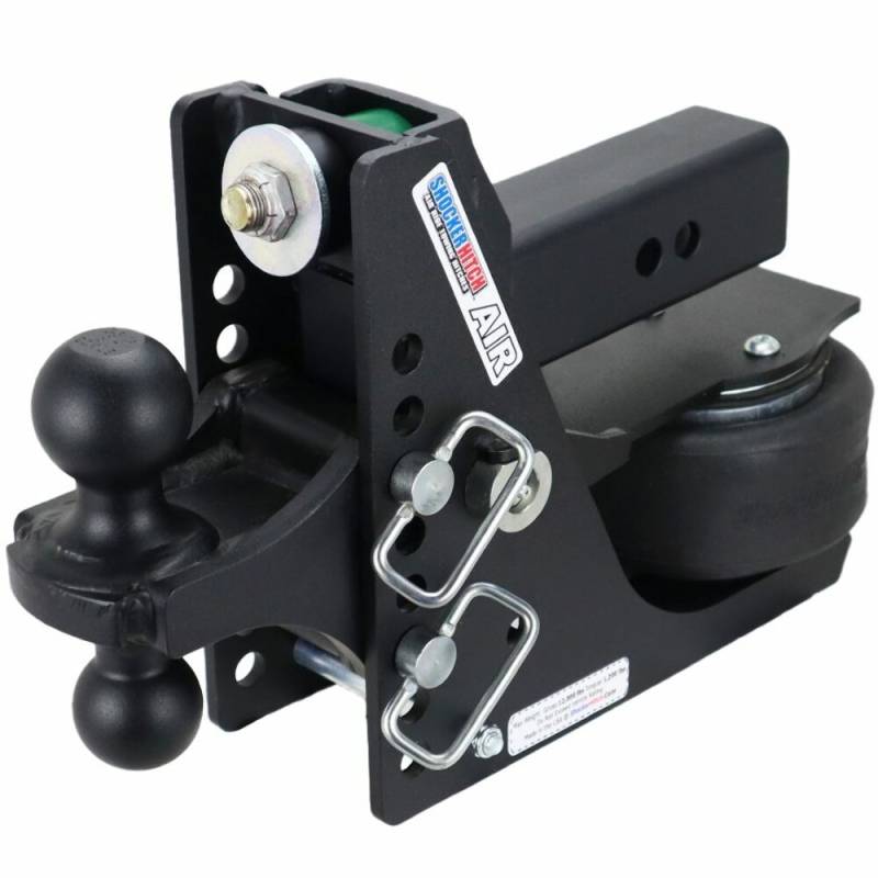 Shocker air hitch provides the ultimate smooth ride whether your travelling on concrete highways, rough or gravel roads. Add instant air ride towing to your pickup and trailer with the Shocker Max Black air receiver hitch with adjustable combo ball mount with both a 2" hitch ball and a 2-5/16" hitch ball. The hitch features an impact resistant matte black textured powder coat finish for years of great looks and performance. This air hitch with combo ball mount offers a 1/2" to 4-1/2" Drop. This shocker absorbing hitch is a miniature air suspension unit mounted between your pickup truck and trailer that channels the bumps, bangs and jerks felt when trailer towing and filters them through the built in air ride system, the dual bump cushions offer additional performance. This shock absorbing ball mount hitch takes the bumps, jerks, tugs and roughness out of trailer towing and cushions your ride and overall towing experience. This Shocker mounts by sliding into a standard receiver tube. The combo multi-ball mount features dual hitch balls with superior strength and versatility for towing a variety of trailers with difference coupler sizes. The adjustable combo ball mount comes in a powder coat finish. Works great on pickup trucks, vans, rv’s, motorhomes and select SUV’s with the receiver hitch tube under the bumper. Upgrade your trailer towing in minutes with the air towing system. The cushioning design, absorbing the bumps so it also reduces the tendency of trailer sway.