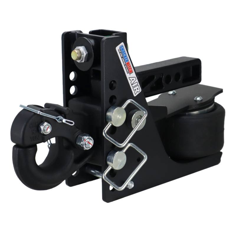 The Shocker 12K Max Black Air Pintle Hook Receiver Hitch is the most durable air pintle hitch on the market. Crafted for longevity, its 12K base frame features an impact-resistant textured matte black finish designed to withstand years of use. Comes adjustable pintle hook hitch that can handle up to 10 tons (20,000 lbs) and incorporates a built-in air ride system for a remarkably smooth towing experience. With eight adjustment holes, that offers 3" to 7" Drop or 2.5" Rise to 6.5" Drop. The Shocker functions as a compact air suspension unit between your truck and trailer, enhancing the towing experience for pickups, trailers, and their contents. It easily mounts into standard receiver tubes, making it ideal for heavy-duty hauling, farm equipment, and military-style towing. Included is a pintle hook that simplifies attachment to trailers with a pintle ring, compatible with 6" OD x 2-1/2" to 3" ID pintle rings. This adjustable pintle hitch excels in farm and heavy-duty contractor applications, offering quick hookups and a smooth ride when pulling trailers with pintle rings such as equipment, tilt, dump and skid steer trailers.