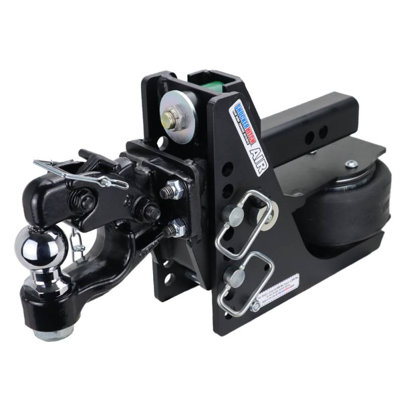 - Kit includes complete Shocker Max Black 12K air receiver hitchwith built-in air ride system & dual bump cushions, adjustable pintle ball combo, and three d-handle ball mount hitch pins with clips.