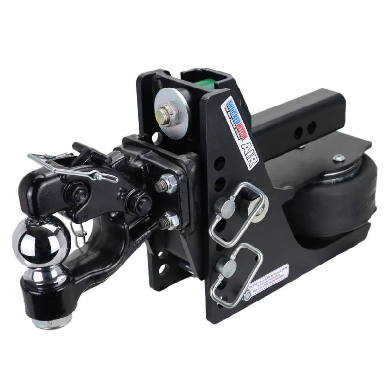 - Kit includes complete Shocker Max Black 12K air receiver hitchwith built-in air ride system & dual bump cushions, adjustable pintle ball combo, and three d-handle ball mount hitch pins with clips.