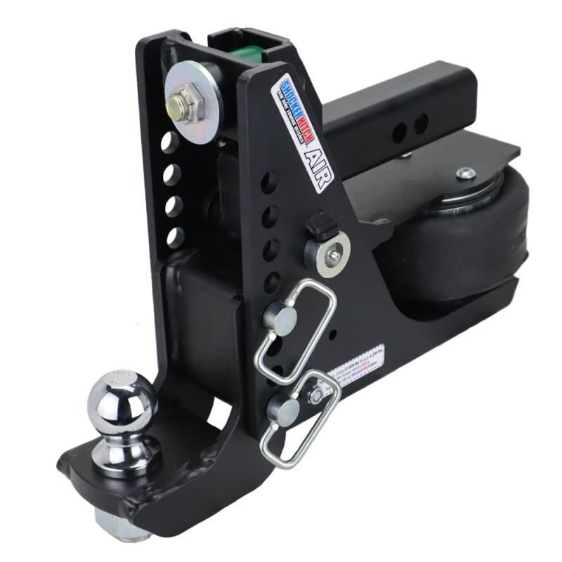 The Shocker Max Black 12K Air Ride receiver drop hitch features instantly adds air ride capability to your tow vehicle and trailer, now available in a sleek matte black premium powder-coat finish. This Max Black bumper mount air hitch from Shocker Hitch is offered with either a 2" or a 2-5/16" hitch ball and accommodates up to an 8-1/2" drop, boasting a towing capacity of 12,000 lbs and a tongue weight of 1,200 lbs. Experience instant air ride towing for your pickup and trailer. This shock-absorbing hitch and ball mount cushion the ride, reducing the bumps and jolts typically associated with towing. The Shocker bumper-style air hitch delivers the ultimate smooth towing experience.