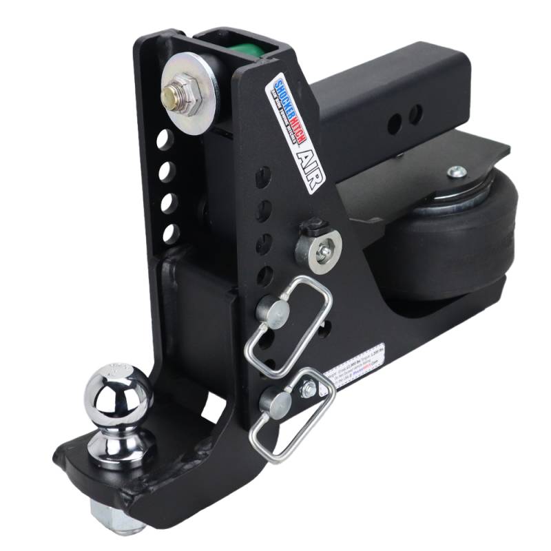 The Shocker Max Black 12K Air Ride receiver drop hitch features instantly adds air ride capability to your tow vehicle and trailer, now available in a sleek matte black premium powder-coat finish. This Max Black bumper mount air hitch from Shocker Hitch is offered with either a 2" or a 2-5/16" hitch ball and accommodates up to an 8-1/2" drop, boasting a towing capacity of 12,000 lbs and a tongue weight of 1,200 lbs. Experience instant air ride towing for your pickup and trailer. This shock-absorbing hitch and ball mount cushion the ride, reducing the bumps and jolts typically associated with towing. The Shocker bumper-style air hitch delivers the ultimate smooth towing experience.