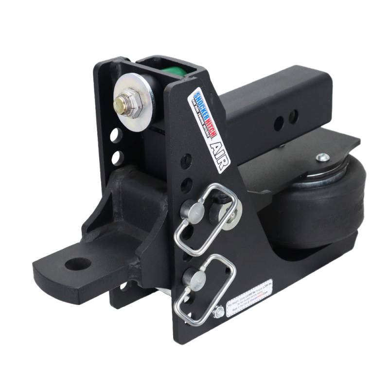 - Kit includes complete Shocker 12K Max Black air receiver hitch with built-in air ride system & dual bump cushions, adjustable drawbar, and three d-handle mount attachment pins with clips.