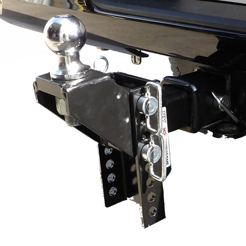 Heavy duty adjustable channel style drop and rise hitch for towing trailers. Flip around design offering more drop and rise. Pick the receiver hitch size and attachment you need. The adjustable channel is great for towing a variety of trailers with different tongue heights. Build your own Shocker XR ball mount hitch and pick the adjustable ball mount you need. 20+ ball mount attachment options. Drop, dual ball, raised, pintle, drawbar, clevis pin, pintle & ball along with combo, raised & drop mounts with sway bar mount tabs. Combo balls are available in black, red, and silver. The Shocker XR ball mount is designed for heavy-duty applications for any towing needs. With up to 20,000 lbs tow rating capacity and 2,000 lbs tongue weight (varies by hitch size chosen) you can pull heavy trailers to campers and boat trailers. These Shocker XR receiver hitch ball mounts are made in the USA and provide 8 adjustment holes or 10 adjustment holes (depending on the model) and can be flipped around for more drop or rise. Give up to 9.5" of drop to 5" of rise depending on the mount attachment chosen. The XR series of ball mounts from Shocker Hitch offers built-in adjustability for maximum versatility. It also features two hitch pin holes for length adjustment, as well as making it compatible with hitch mount towing mud flaps & rock guards. This Shocker XR ball mount has a textured black powder coat finish & attaches by sliding into a standard receiver tube. Available for 2", 2-1/2" and 3" Receiver Hitches. With this adjustable XR ball mount, if you select a raised or drop mount with ball, the ball shank is 1-1/4" in diameter and features a bolt-on hitch ball with a premium chrome finish. The 2-5/16" ball is rated at 20,000 lbs & the the 2" ball is rated at 10,000 lbs.