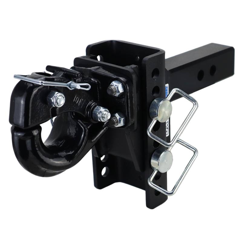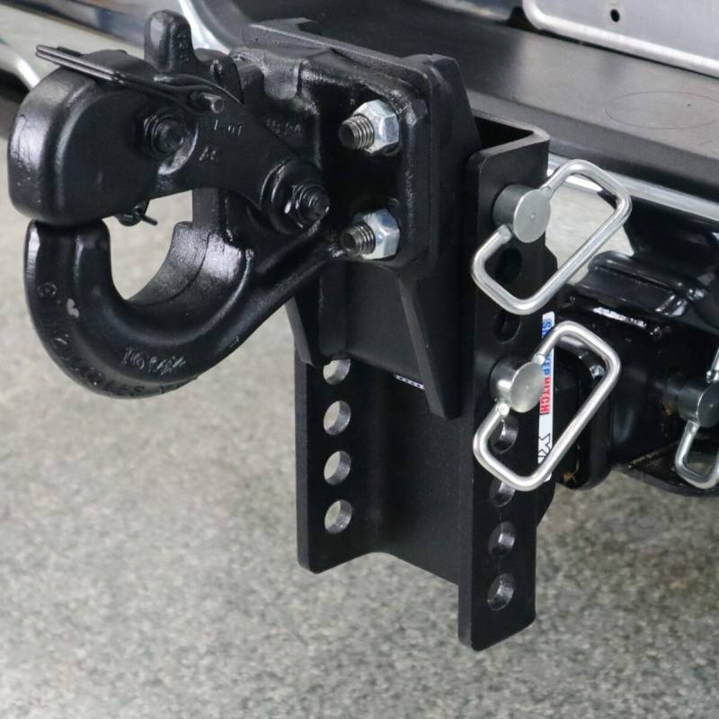- Comes Complete: Includes everything you need, the adjustable Shocker XR series base frame hitch assembly, adjustable 10-ton pintle hook & 2 d-handle ball mount pins with clips.