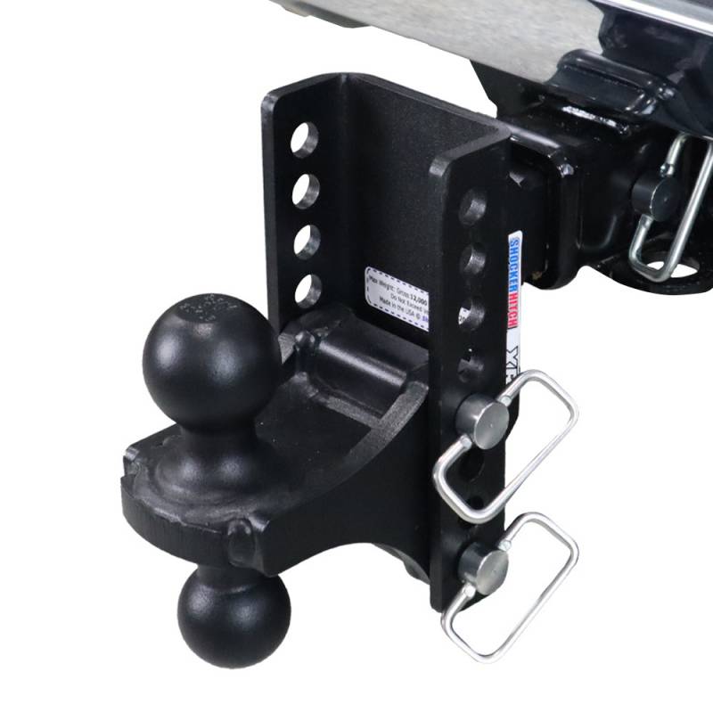 The Shocker XR Adjustable dual ball mount has a combo multi-ball mount with both a 2" hitch ball and a 2-5/16" hitch ball. This XR series ball mount has adjustability of 4" of rise to 4" of drop or 6" to 6" of drop with a up to 20,000 lbs tow rating capacity and 2,000 lbs tongue weight depending on shank size. The combo ball mount features a tough Powder Coated Finish, looks sharp and gets the job done. Shocker XR hitch with combo balls provides the ultimate in versatility. Great for a ton of trailer towing applications and idea if you tow a variety of trailers or use different vernicles when towing. The XR has built in adjustability maximum versatility for your towing needs. This Shocker XR ball mount attaches by sliding into a standard receiver tube. Use this adjustable combo ball mount however you need to for tons of versatility. It also features two hitch pin holes for length adjustment, as well as making it compatible with hitch mount towing mud flaps & rock guards. It also works with all our other shocker ball mount attachments including drop, raised, pintle, pintle & ball, drawbar, clevis along with our sway bar mount tab options. With the combo adjustable XR ball mount, the hitch balls are manufactured together for maximum strength, durability and trailer towing versatility.