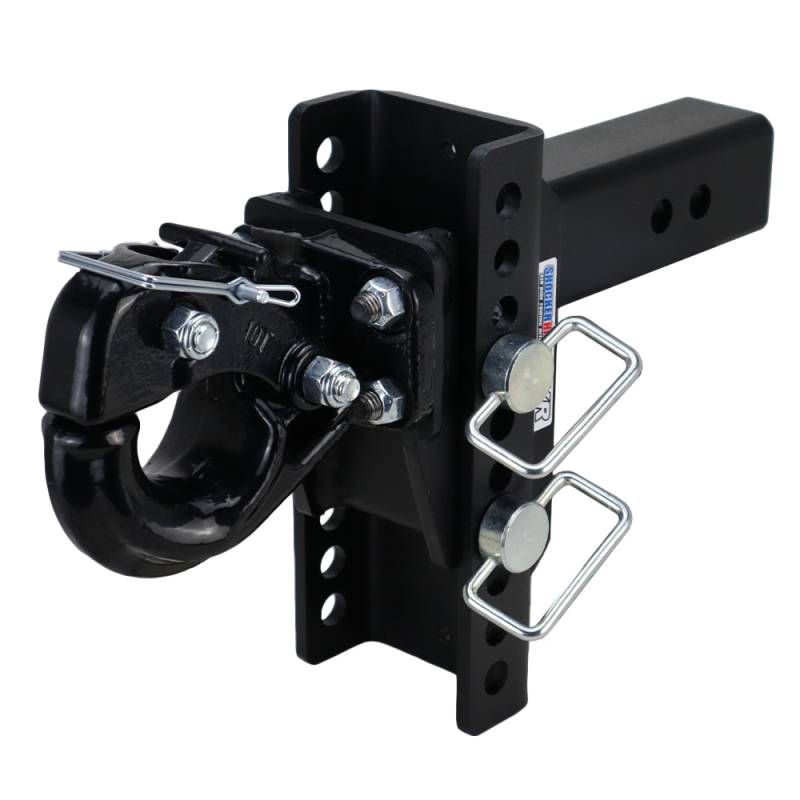 The Shocker XR Adjustable channel mount 10-ton pintle hook hitch with a 5.5" of rise to 10.5" of drop depending on model selected. The adjustable pintle hitch offers up to 20,000 lbs tow rating capacity and 2,000 lbs tongue weight depending on hitch size chosen. The 10-Ton Shocker XR pintle hook hitch ball mount provides the ultimate in versatility. The XR pintle hitch has built in adjustability maximum versatility for your towing needs for equipment, skid steer and dump trailers along with around the farm, overlanding and off-road trailers. Great for pulling trailers with pintle rings, the adjustable channel design makes it easy to accommodate for varying trailer tongue heights or pickup heights. This Shocker XR pintle hook ball mount attaches by sliding into a standard receiver tube. This pintle hook fits 6" OD x 2.5" to 3" ID pintle rings. This military style hitch is great for trailers with pintle ring for quick hookup. Available for 2", 2-1/2" & 3" receivers with 8 or 10 adjustment holes. The design of our adjustable pintle adds tons of versatility. Often used on dump and skid steer trailers, around the farm and is becoming popular with the offroad for overlanding trailers with pintle hookup.