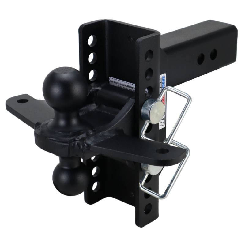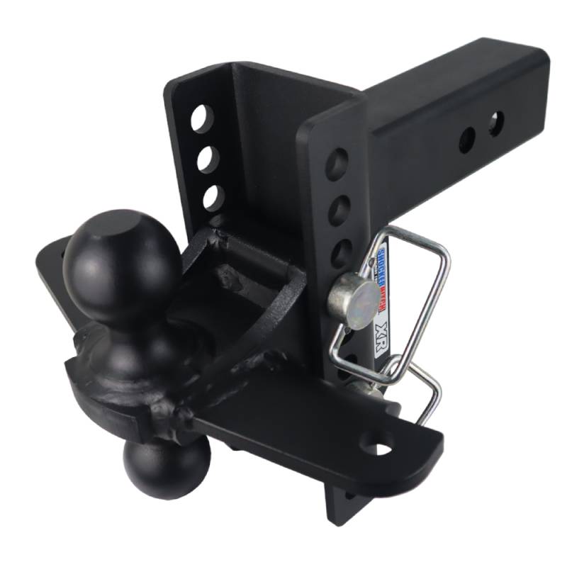 The Shocker XR drop hitch with adjustable combo ball hitch with sway bar mounting tabs comes with 2 ball mount attachment pins and works with all our ball mount attachments. This adjustable & versatile design offers up to 20,000 lbs gtw along with up to 2,000 lbs tongue weight and 4" of rise to 4" of drop or 6" rise to 6" of drop, depending on hitch size selected. If sway is an issue and you need an economical solution, this is it. The XR has built-in adjustability and maximum versatility for your towing needs. Plus the hitch can be flipped around for more drop or rise. The welded sway bar mount tabs with holes are great for using with friction sway control bar kits. The sway bar tabs are for use with sway control kits such as the Shocker friction sway control arm bar kit (or similar) to reduce trailer sway. It also features two hitch pin holes for length adjustment, as well as making it compatible with hitch mount towing mud flaps & rock guards. Made by Shocker Hitch USA. XR Hitch as a premium textured matte black powder coat finish and the combo mount with sway tabs a silver textured powder coat finish for resistance to the elements.