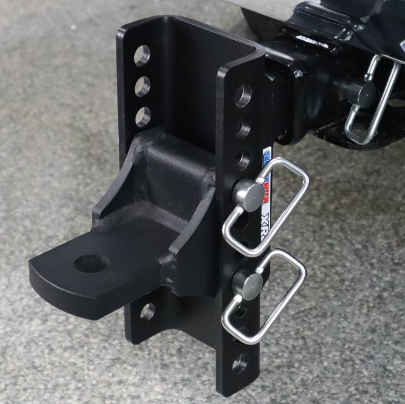 - Kit Includes a channel style Shocker XR drop hitch with 8 or 10 holes, adjustable drawbar mount & 2 d-handle ball mount pins with clips.