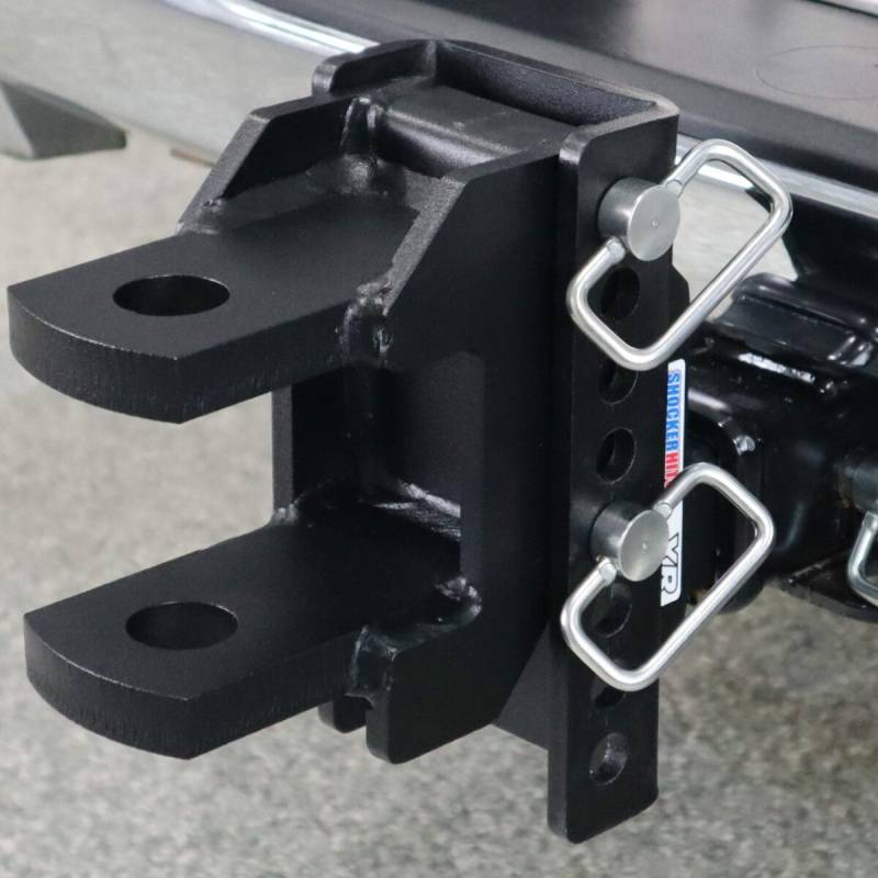 - Comes Complete: Includes everything you need, the adjustable Shocker XR channel hitch, adjustable clevis pin mount with 1-1/4" holes & 2 d-handle ball mount attachment pins with clips.