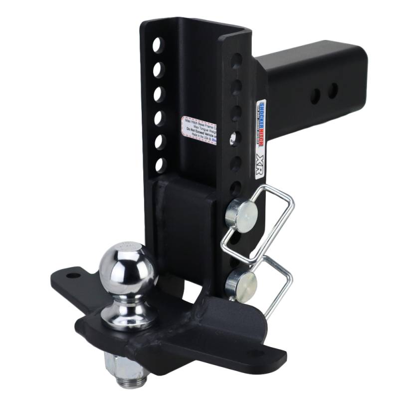 If you need an affordable drop hitch and have trailer sway issues, here is the answer. The Shocker XR Adjustable drop hitch ball mount with sway control bar mounting tabs is available with a 2" hitch ball or a 2-5/16" hitch ball. Choose with a 0" to 7-1/2" or 9" of drop and is perfect for taller or lifted pickup trucks with trailer sway issues. This sway control bar tab drop ball mount has 2 sway control tabs for mounting the basic sway control arm bar(s) & mini-balls such as the Shocker hitch friction sway arm bar kit. Get up to 20,000 lbs tow rating capacity, depending on hitch selected. Shocker XR drop ball mount provides the ultimate in versatility. You can also flipped the entire hitch frame around for more drop or rise. Upgrade your trailer towing with a drop hitch with sway bar mounting tabs. The XR channel drop hitch has built-in adjustability and maximum versatility for your towing needs. This Shocker XR drop ball mount attaches by sliding into a standard receiver tube. Use this adjustable ball mount however you need to for tons of versatility. With this adjustable XR drop ball mount, the hitch balls bolt to drop mount with a 1-1/4" thick bolt and feature a premium chrome finish.