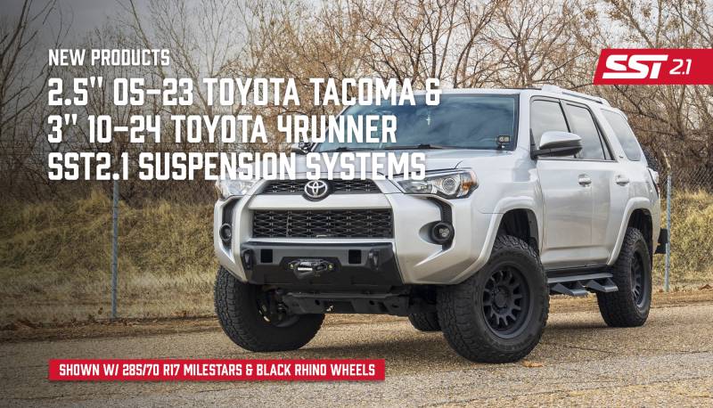 Toyota 4Runner owners know adventure isn’t just a weekend hobby — it’s a way of life. That’s why ReadyLIFT developed the all-new SST2.1 Suspension Systems: purpose-built to deliver the perfect blend of aggressive styling, enhanced off-road capability, and everyday drivability. Whether you're crawling rocky trails or carving through city streets, this system gives your Toyota the lift it deserves—literally.Precision-Engineered for Peak Performance4Runner (2010–2024) | Kit #62-50340: The 3” SST2.1 Lift Kit offers a bold lifted stance while preserving Toyota’s legendary ride comfort. It's your gateway to larger wheels, superior ground clearance, and a commanding presence on and off the pavement.Why Choose ReadyLIFT SST2.1?? Bigger Tires, Bigger Adventures3” lift increases clearance for up to 33” tires Optimized for 285/65R18 tires on an 18x9 +0 offset wheel Smart Suspension Technology (SST) allows for a no-cut, bolt-on installation DOM Tubular Upper Control Arms (4Runner Kit) with corrected ball joint angles for improved strength and movement ? Tuned for On-Road Comfort, Built for Off-Road ControlFalcon 2.1 monotube dampers deliver a smooth, confident ride Enhanced stability and handling at highway speeds Superior off-road performance over sand, rocks, and uneven terrain Durable 6061-T6 Aluminum shock bodies resist impact and corrosion ? Form Meets FunctionAggressive stance that turns heads and tackles trails Integrated front skid plate for added protection and a rugged look The 3” SST2.1 Lift Kit offers a bold lifted stance while preserving Toyota’s legendary ride comfort. It's your gateway to larger wheels, superior ground clearance, and a commanding presence on and off the pavement. Achieve a 2.5” front lift, providing clearance for larger wheels and tires. Accommodates tire sizes like: Up to 33” tall tire. Up to 295/65R18 on an 18x9 wide +0 offset.
