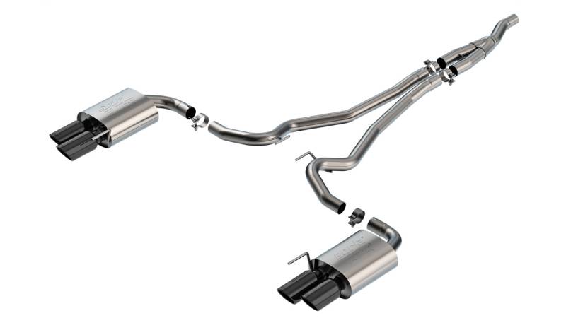 Cat-Back Exhaust System - ATAK This 2.5" diameter BORLA Cat-Back system is designed for use on EcoBoost cars WITHOUT the Active Exhaust feature. It features Borla's aggressive ATAK sound with no drone inside the vehicle, and dual 4" round black chrome on T-304 stainless steel tips. Using BORLA Stainless Steel Polish p# 21499 is NOT recommended with these black chrome tips. We suggest cleaning the tips with hot water and a microfiber cloth. Systems with bright chrome on T-304 stainless steel tips, and carbon fiber tips are also available. If your car has 1 tip on each muffler and you want to upgrade it to 2 tips on each muffler (also known as quad tips), this is the system for you. It is designed to work with the quad tip (2 tips per muffler) Original Equipment (O.E.) Ford Valance ONLY. To install this system on a vehicle that came with one tip per muffler you will NEED TO BUY and install a different valance. Ford quad tip valance part numbers: With Parking Sensors = PR3Z-17F828-DA, Without Parking Sensors = PR3Z-17F828-CA. BORLA Cat-Back and Axle-Back exhaust systems feature patented straight-through and multi-core technology designed to unleash hidden horsepower. Increased exhaust velocity adds power, driving excitement, fuel economy, and the distinctive BORLA Sound of Power respected by motoring enthusiasts everywhere. Each system is built from premium T-304 stainless steel, superior to T-400 series knockoffs (such as 409), to give you the absolute best in performance and durability. Ultra-smooth mandrel bends ensure maximum flow & power, and precision computer numerical control (CNC) manufacturing ensures an accurate fit. Best of all, BORLA stands behind every system with a Million-Mile Warranty. Just what you'd expect from the world's most experienced (and most winning) exhaust brand. For vehicles WITHOUT Active Exhaust Each BORLA muffler assembly has two tips Will NOT fit vehicles with O.E. mufflers with one tip per muffler unless valance is changed