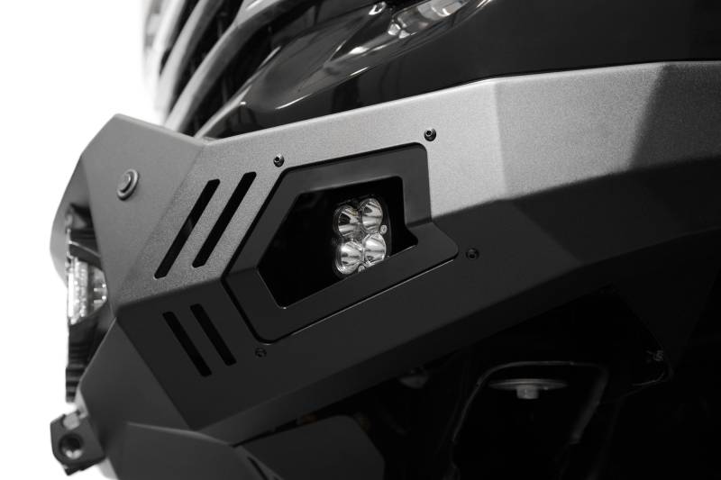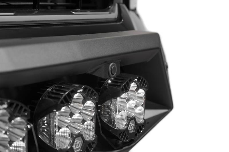 Our Front Bumper offers off-road utility and an elevated styling. The center cutout fits either five Baja Designs LP6 lights or six RIGID Industries 360 Series 6 round lights, or two radiused 40-inch light bars. Additional lighting options are provided by 3-inch cube light mounts in the wings.\nThe bumper features a winch mount and two 1-inch thick D-ring mounts. It retains the OEM parking sensors and adaptive cruise control. The bumper is constructed from steel and finished in a 2-stage hammer black powder coat. It is fully bolt-on and made in the USA.