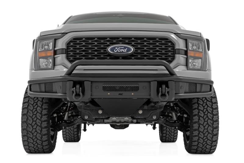 Take your truck's off-road capability and style to the next level with this rugged, trail-ready upgrade. Built for performance and designed to turn heads, this bumper is ready for any adventure.Sleek & Bold Design: Constructed with durable 2-inch diameter tubing and finished in a corrosion-resistant Satin Black coating, this bumper delivers a bold, aggressive look that complements your F-150's rugged stance.Trail-Ready Strength: Equipped with a heavy-duty D-ring set boasting a massive 4.75-ton capacity, this bumper provides reliable recovery points for your toughest adventures.Ultimate Off-Road Protection: An integrated skid plate shields vital components from rocks, debris, and rough terrain, while the bolt-on stinger bar enhances front-end protection and style.Built-In Light Bar Mount: The stinger bar isn't just for protection - it also functions as a sturdy mount for an LED light bar, giving you the flexibility to enhance nighttime visibility on the trails.With bold styling, unbeatable strength, and essential off-road features, Rough Country's Front Tubular Bumper is the game-changing upgrade your F-150 deserves. Ditch the stock look and conquer the trails with confidence!