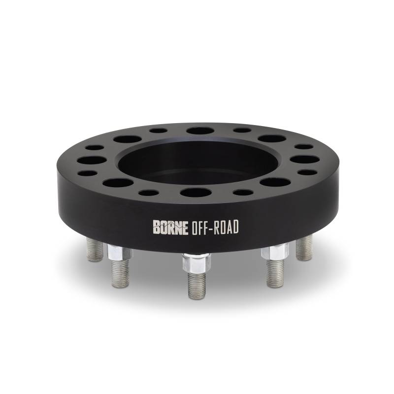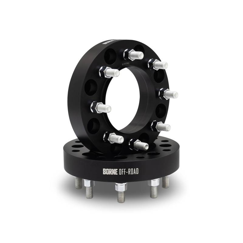 Borne Off-Road Wheel Adapters, 8x180 to 8x6.5, 1.5in, Black Wheel spacers are a great way to create brake clearance, add track width, prevent tire rub, and allow you to put your old wheels on your new truck. To support our GM truck enthusiasts, Borne Off-Road now offers a complete catalog of wheel spacers for a variety of common thread patterns, center bores, and thicknesses. Quality material selection, precise engineering, and meticulous manufacturing are critical elements to creating our incredibly robust products, and our wheel spacers are no different. Each spacer is forged from 6061-T6 aluminum. This material offers a perfect blend of strength and lightness, both are extremely vital in this application. Our spacers feature grade-12.9 steel studs and lug nuts, ensuring a safe and secure installation. Borne Off-Road's hub-centric design provides a direct extension of the axle hub for precise wheel fitment, reduced load on the hardware, and ensures safe and smooth driving. Borne Off-Road wheel spacers feature a black anodized finish to ensure protection against corrosion. Each kit contains two wheel spacers with pre-installed studs and all hardware necessary for installation. As with all our products, this wheel spacer kit includes our signature Borne Lifetime Warranty. Also fit vehicles with 8x180.1 lug pattern and 165.1 center bore Available in 1.5” and 2.0” thickness Forged 6061-T6 aluminum construction provides the perfect blend of lightness and strength