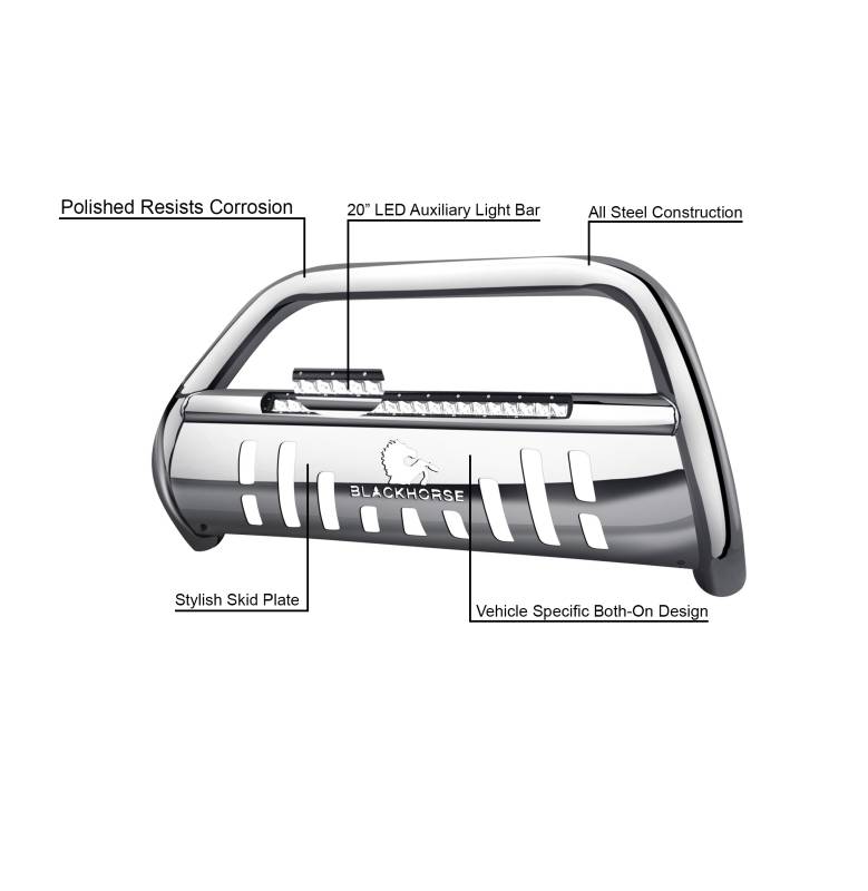 Beacon Bull Bar Black Horse Off Road Beacon Bull Bar Stainless Steel Stainless Steel Skid Plate Incl. Pre-installed 20LED Light Bar W/ LED It May Interfere with Vehicles equipped with Emergency Braking Systems, Adaptive Cruise Control and Parking Sensors Polished Stainless Steel Beacon Bull Bar BE-F7408S by Black Horse Off Road compatible with 2015-2018 Lexus NX200T/2019-2021 Lexus NX300/2015-2021 Lexus NX300H No-Drill/ Vehicle-Specific Application for Custom Fit Environmentally friendly option to chrome-plating Solid frame-mounted bolt-on Welded 1-piece construction