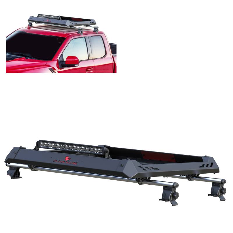 Traveler Roof Rack Black Horse Off Road Traveler Roof Rack Silver Aluminum Box 2 contains: 33lbs, 50x15x9 W/ Aluminum Basket Complete Roof Rack System 1set of Traveler Cross Bars Part# TR-60BK 1 Aluminum Roof Rack 55"x45" Part# TRRB2 Fabricated with high strength T6 Black Anodized Aircraft Aluminum Includes locking bed-rail clamps No - drill, bolt-on installation