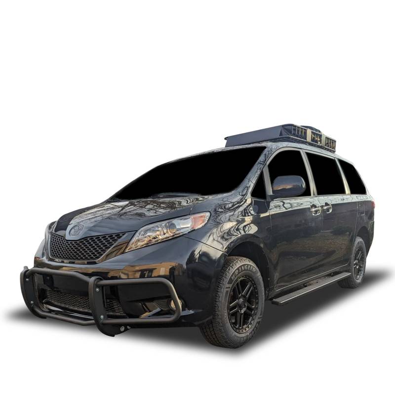 Front Runner Black Horse Off Road Front Runner Black Steel Modular It May Interfere with Vehicles equipped with Emergency Braking Systems, Adaptive Cruise Control and Parking Sensors Black Horse Front Runner compatible with 2021-2023 Toyota Sienna Made from 16ga. cold-rolled mild steel Mandrel-bent tubing Chip -resistant satin black powder coat finish over corrosion resistant E- Coat Protects your front bumper from minor bumps and scrapes