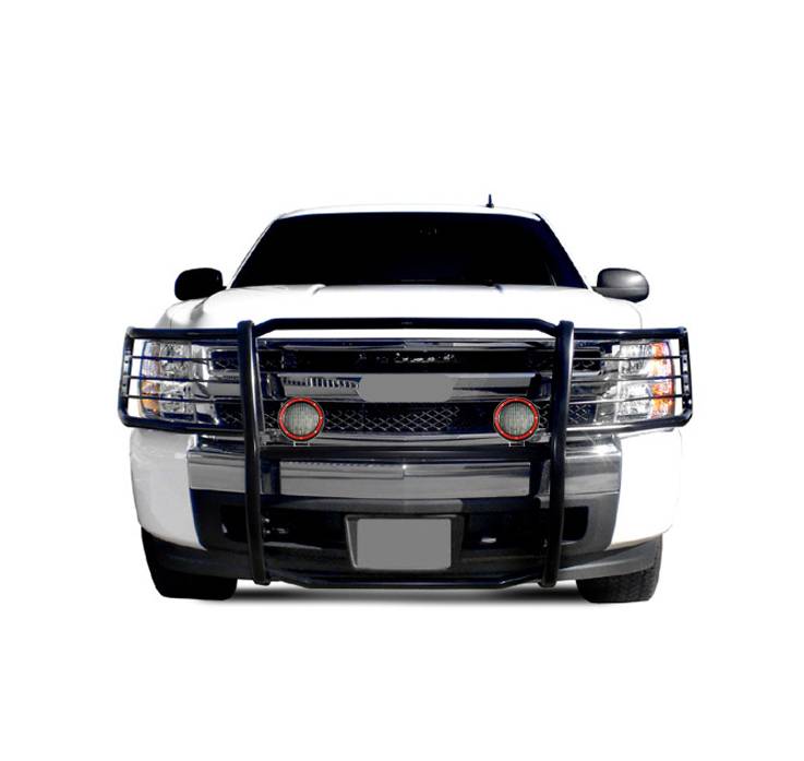 Grille Guard Kit Black Horse Off Road Grille Guard Kit Black Steel Modular Pair of 5.3" Dia. LED Flood Lights w/ Red Trim Rings Wiring Harness and Switch It May Interfere with Vehicles equipped with Emergency Braking Systems, Adaptive Cruise Control and Parking Sensors Black Horse Off-Road Modular Design Black Powder Coat Grille Guard Kit 17A035700A2MA-PLFR Compatible with 2007-2013 Chevrolet Silverado 1500 No-Drill/ Vehicle-Specific Application for Custom Fit'solid frame-mounted bolt-on, no drill installation / Welded 3-piece bolt-together construction ?" thick HRPO vertical steel plates