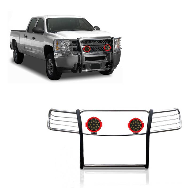Grille Guard Kit Black Horse Off Road Grille Guard Kit'stainless Steel Stainless Steel Modular Incl. pair of 7.0"Dia. LED Lights w/Red Trim Rings w/ Wiring Harness and Switch It May Interfere with Vehicles equipped with Emergency Braking Systems, Adaptive Cruise Control and Parking Sensors Black Horse Off-Road Modular Design Polished Stainless Steel Grille Guard Kit17A035700A2MSS-PLR Compatible with 2007-2013 Chevrolet Silverado 1500 No-Drill/ Vehicle-Specific Application for Custom Fit Environmentally friendly option to chrome-plating / Solid frame-mounted bolt-on, no drill installation Welded 3-piece bolt-together construction