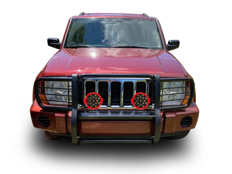 Grille Guard Kit Black Horse Off Road Grille Guard Kit Black Steel Modular Incl. pair of 7.0"Dia. LED Lights w/Red Trim Rings w/ Wiring Harness and Switch It May Interfere with Vehicles equipped with Emergency Braking Systems, Adaptive Cruise Control and Parking Sensors Black Horse Off-Road Modular Design Black Powder Coat Grille Guard Kit 17A081000MA-PLR Compatible with 2006-2010 Jeep Commander No-Drill/ Vehicle-Specific Application for Custom Fit'solid frame-mounted bolt-on, no drill installation / Welded 3-piece bolt-together construction 1 1/2 ?diameter 16ga. cold-rolled, mandrel-bent mild steel tubing
