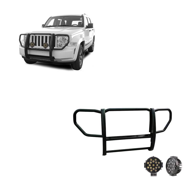 Grille Guard Kit Black Horse Off Road Grille Guard Kit Black Steel 1-Piece Incl. pair of 7.0"Dia. LED Lights w/ Black Trim Rings w/ Wiring Harness and Switch It May Interfere with Vehicles equipped with Emergency Braking Systems, Adaptive Cruise Control and Parking Sensors Black Horse Off-Road Modular Design Black Powder Coat Grille Guard Kit 17A086400A-PLB Compatible with 2008-2012 Jeep Liberty No-Drill/ Vehicle-Specific Application for Custom Fit'solid frame-mounted bolt-on, no drill installation / Welded 3-piece bolt-together construction 1 1/2 ?diameter 16ga. cold-rolled, mandrel-bent mild steel tubing