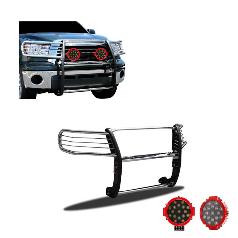 Grille Guard Kit Black Horse Off Road Grille Guard Kit Stainless Steel Stainless Steel Modular Incl. pair of 7.0"Dia. LED Lights w/Red Trim Rings w/ Wiring Harness and Switch Excl. 08-21 Platinum/Limited model It May Interfere with Vehicles equipped with Emergency Braking Systems, Adaptive Cruise Control and Parking Sensors Black Horse Off-Road Modular Design Polished Stainless Steel Grille Guard Kit17A098900MSS-PLR Compatible with 2008-2022 Toyota Sequoia/2007-2021 Toyota Tundra No-Drill/ Vehicle-Specific Application for Custom Fit Environmentally friendly option to chrome-plating / Solid frame-mounted bolt-on, no drill installation Welded 3-piece bolt-together construction