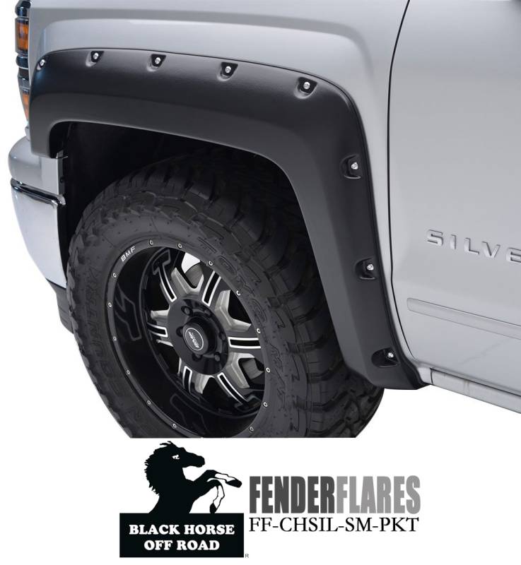 Fender Flares Black Horse Off Road Fender Flares Black TPO Riveted Style Black Horse Off Road Black Bolt-head Style - Smooth Fender Flares (FF-CHSIL-SM-PKT) Compatible with 2014-2018 Chevrolet Silverado 1500 Keeps the vehicle street -legal with larger wheels and tires. Adds about 3" to the width of the fender and about 6" in height. Precision vacuum-formed in automotive-grade high impact ABS plastic for a custom-fit.