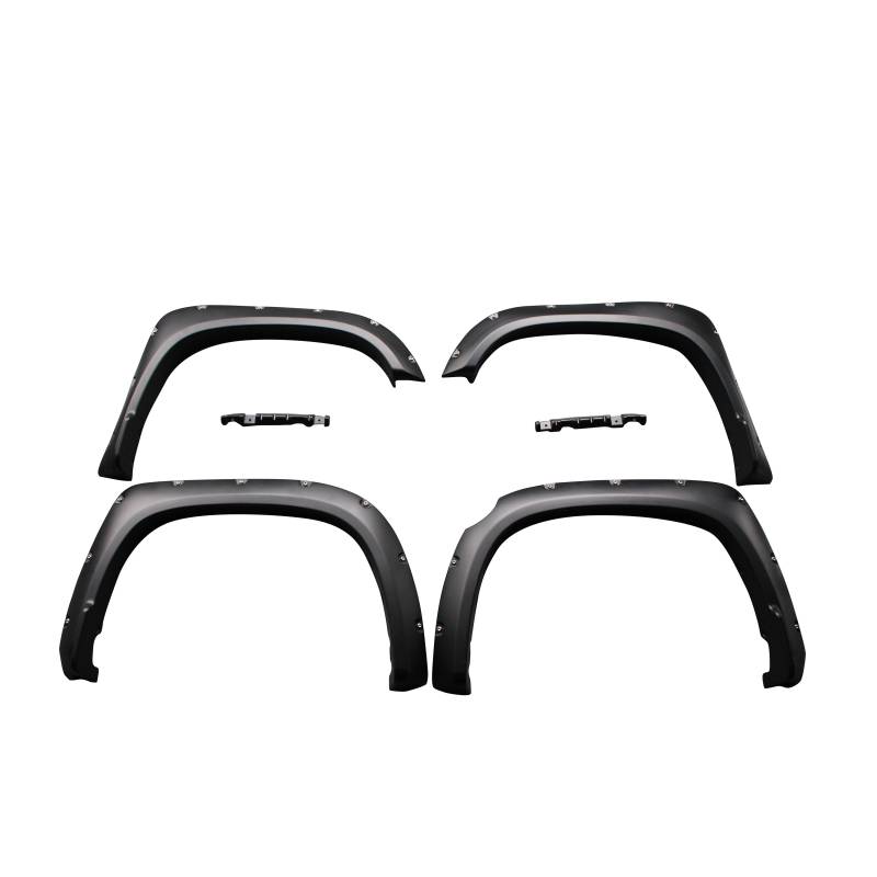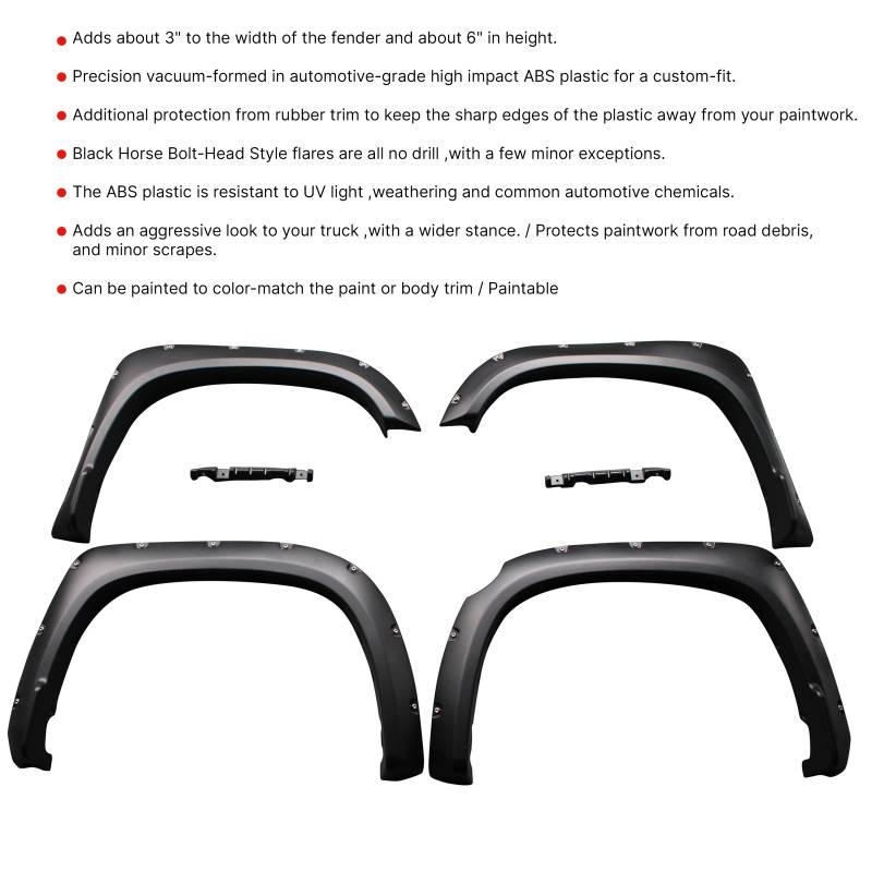 Fender Flares Black Horse Off Road Fender Flares Black TPO Riveted Style Black Horse Off Road Black Bolt-head Style - Smooth Fender Flares (FF-TOTUL-SM-PKT) Compatible with 2014-2021 Toyota Tundra Keeps the vehicle street -legal with larger wheels and tires. Adds about 3" to the width of the fender and about 6" in height. Precision vacuum-formed in automotive-grade high impact ABS plastic for a custom-fit.
