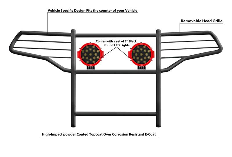 Grille Guard Kit Black Horse Off Road Grille Guard Kit Black Steel Modular Incl. pair of 7.0"Dia. LED Lights w/Red Trim Rings w/ Wiring Harness and Switch Doesn't work with Adaptive Cruise Control Doesn't work with Adaptive Cruise Control It May Interfere with Vehicles equipped with Emergency Braking Systems, Adaptive Cruise Control and Parking Sensors Black Horse Off-Road Modular Design Black Powder Coat Grille Guard Kit 17FJ31MA-PLR Compatible with 2020-2024 Ford Explorer No-Drill/ Vehicle-Specific Application for Custom Fit Solid frame-mounted bolt-on, no drill installation / Welded 3-piece bolt-together construction 1 1/2" diameter 16ga. cold-rolled, mandrel-bent mild steel tubing