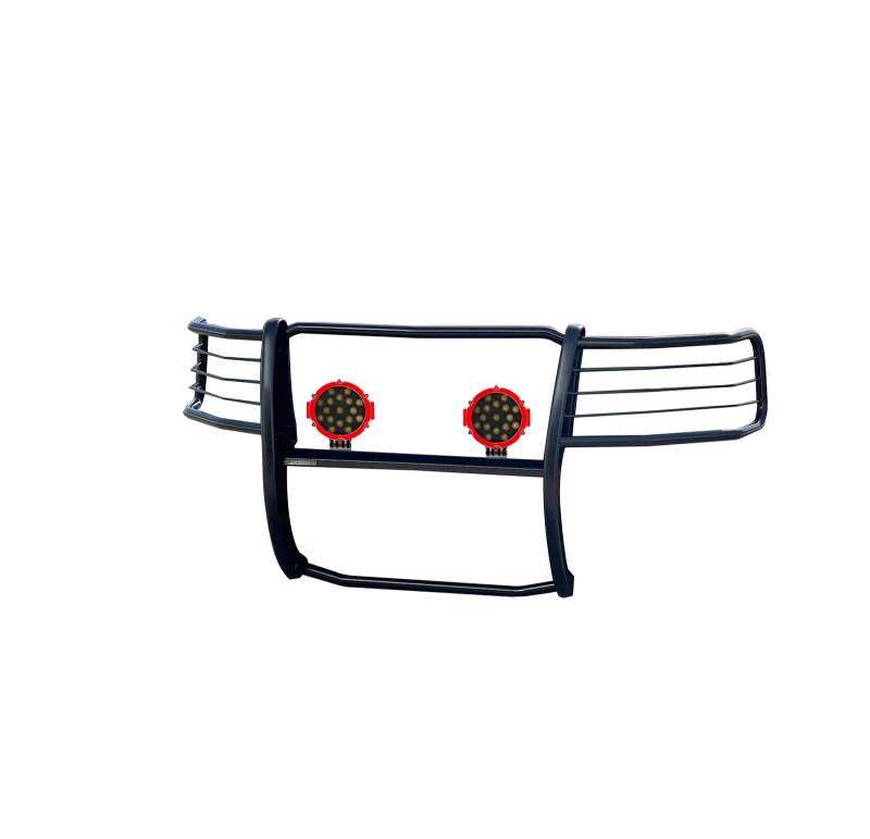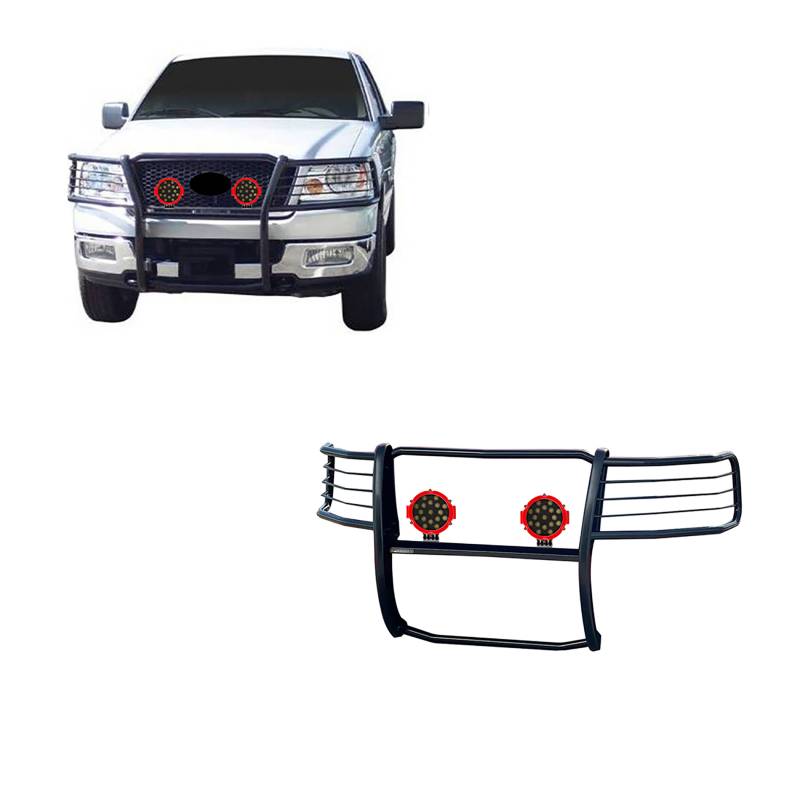 Grille Guard Kit Black Horse Off Road Grille Guard Kit Black Steel Modular Incl. pair of 7.0"Dia. LED Lights w/Red Trim Rings w/ Wiring Harness and Switch Excludes Heritage edition Black Horse Off-Road Modular Design Black Powder Coat Grille Guard Kit 17FP28MA-PLR Compatible with 2004-2008 Ford F-150 No-Drill/ Vehicle-Specific Application for Custom Fit'solid frame-mounted bolt-on, no drill installation / Welded 3-piece bolt-together construction 1 1/2 ?diameter 16ga. cold-rolled, mandrel-bent mild steel tubing