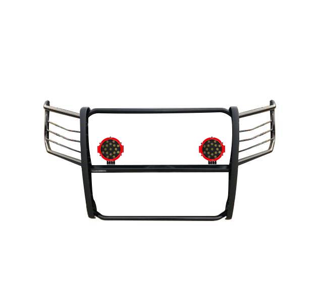 Grille Guard Kit Black Horse Off Road Grille Guard Kit Black Steel Modular Incl. pair of 7.0"Dia. LED Lights w/Red Trim Rings w/ Wiring Harness and Switch Incl. F150 EcoBoost / Excl. all F150 Raptor models, 20-22 Diesel models and 22-23 F150 Lightning EV It May Interfere with Vehicles equipped with Emergency Braking Systems, Adaptive Cruise Control and Parking Sensors Black Horse Off-Road Modular Design Black Powder Coat Grille Guard Kit 17FP32MA-PLR Compatible with 2015-2024 Ford F-150 No-Drill/ Vehicle-Specific Application for Custom Fit'solid frame-mounted bolt-on, no drill installation / Welded 3-piece bolt-together construction 1 1/2 ?diameter 16ga. cold-rolled, mandrel-bent mild steel tubing