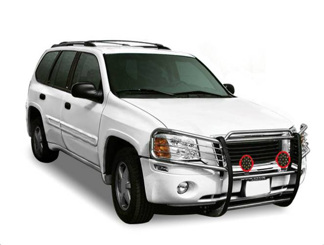 Grille Guard Kit Black Horse Off Road Grille Guard Kit'stainless Steel Stainless Steel Modular Incl. pair of 7.0"Dia. LED Lights w/Red Trim Rings w/ Wiring Harness and Switch It May Interfere with Vehicles equipped with Emergency Braking Systems, Adaptive Cruise Control and Parking Sensors Black Horse Off-Road Modular Design Polished Stainless Steel Grille Guard Kit17GD26MSS-PLR Compatible with 2002-2009 GMC Envoy No-Drill/ Vehicle-Specific Application for Custom Fit Environmentally friendly option to chrome-plating / Solid frame-mounted bolt-on, no drill installation Welded 3-piece bolt-together construction
