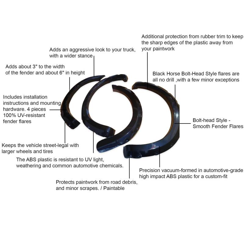 Fender Flares Black Horse Off Road Fender Flares Shiny Black TPO Riveted Style Black Horse Off Road Black Bolt-head Style - Smooth Fender Flares Compatible with 2021-2024 Ford F-150 Keeps the vehicle street -legal with larger wheels and tires. Adds about 3" to the width of the fender and about 6" in height. Precision vacuum-formed in automotive-grade high impact ABS plastic for a custom-fit.