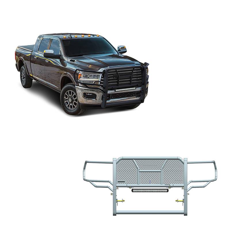 Rugged Heavy Duty Grille Guard Kit Black Horse Off Road Rugged Heavy Duty Grille Guard Kit Black Steel Modular Box 2: 22 lbs 40x25x9 & Includes 1 20in LED Double Row Lights Excl. Denali & Power Wagon Trim It May Interfere with Vehicles equipped with Emergency Braking Systems, Adaptive Cruise Control and Parking Sensors Black Horse Off-Road Rugged Series Modular Design Black Grille Guard Kit RU-DORA20-B-LED - compatible with 2019-2024 Ram 2500/2019-2024 Ram 3500 Patent Approved No-Drill/ Vehicle-Specific Application for Custom Fit Solid frame-mounted bolt-on, no drill installation 3-piece bolt-together construction