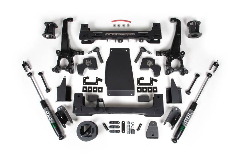 materials and superior manufacturing standards, the Zone Offroad lift kit goes beyond the typical market offerings, providing a robust and reliable upgrade that stands the test of time. Provides 6 inches of front lift while leveling the front and rear of the truck while fitting 37" tires Corrects geometry while offering more ground clearance than other kits on the market Can be purchased with either Zone Nitro or Fox Adventure Series 2.0 shocks High strength steel cross members with skid plate designed and manufactured in the USA Maintains ride quality and handling