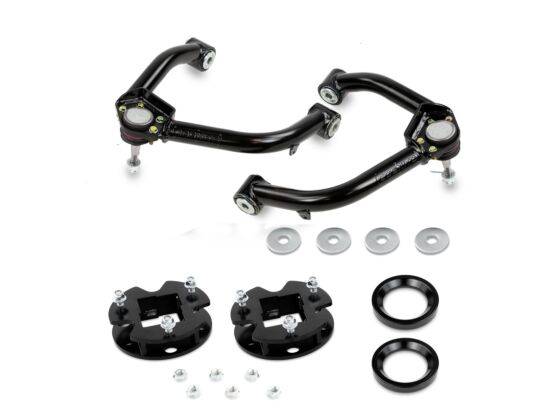 3" Standard Leveling Kit 2019 GM 1500 (Excludes AT4 and Trail Boss) We've bundled everything you need in a leveling kit for your Silverado/Sierra 1500 2WD/4WD with high quality Cognito components.There's no guesswork. Cognito components are engineered, manufactured and assembled in the USA. The Cognito 3 Inch Standard Leveling Kit includes the Cognito Standard Upper Control Arm Kit, 1.5 Inch Strut Spacer Kit and .5 Inch Preload Spacer Kit- all with hardware included.The Cognito Standard Upper Control Arms are built with a modified ball joint angle to eliminate travel limitations of the ball joint in lifted applications. This design also eliminates the need to cut the service perch off of the truck if they are used as part of our Cognito package or as a stock replacement.The 1.5 Inch Strut Spacers and .5 Inch Steel Preload Spacers are constructed out of heavy duty steel and finished with a durable semi-gloss black power coating. Made in the USA. Yields 3 Inches of front lift 1.5 Inch Strut Spacer Kit .5 Inch Preload Spacer Kit Cognito Standard Upper Control Arm Kit Improved ball joint angle