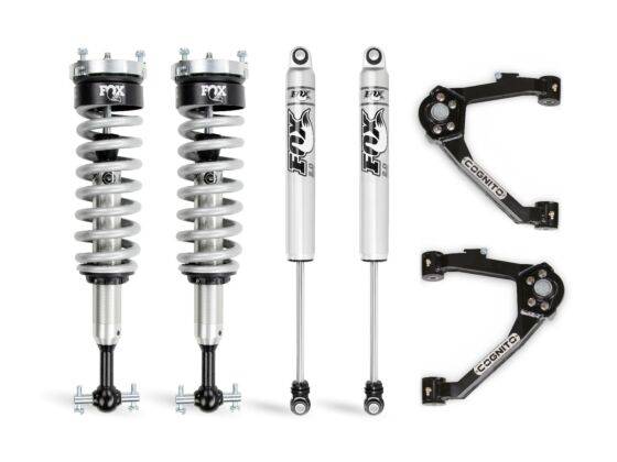 Cognito 3" Performance Leveling Kit 14-18 GM 1500 w/ OE Al or Stamped Steel UCA We have bundled everything you need in a leveling kit for your Silverado/Sierra 1500 2WD/4WD with high quality Cognito components. There is no guesswork. Cognito components are engineered, manufactured, and assembled in the USA. The Cognito 3-inch Performance Ball Joint Leveling Kit includes the Cognito Ball Joint SM Series Upper Control Arm Kit, Fox Performance Series Coilover front shocks and Fox Performance Series Monotube rear shocks with hardware included.The Cognito Ball Joint SM Series Upper Control Arms add style, function, and performance to your vehicle by improving the allowable droop travel for a better ride quality. The control arm kit features boxed sheet metal arms that are CNC robot welded and powder coated semi-gloss black. Press in ball joints are pre-installed and retained with black anodized, Cognito branded laser etched caps. New crush sleeves and polyurethane bushings are included. The Cognito Ball Joint SM Series Upper Control Arms provide ample droop travel that is required for good ride quality and all suspension components to last and work properly.The Fox 2.0 Performance Series shocks contain the latest in shock technology to transform the performance of your truck. The Fox 2.0 Performance Series Coilover IFP front shocks are rust resistant and have a metal impact extruded aluminum body to increase cooling capacity. The IFP eliminates oil aeration allowing maximum performance from the factory-tuned, precision valving. They are easy to install and provide a comfortable on-road ride and predictable off-road handling in even the toughest conditions. Yields 3 Inches of front lift Cognito Ball Joint SM Series Upper Control Arm Kit A Pair of Fox 2.0 Performance Series Coilover IFP Front Shocks A Pair of Fox 2.0 Performance Series Monotube Rear Shocks Enhances the trucks appearance and reduces the factory nose down rake