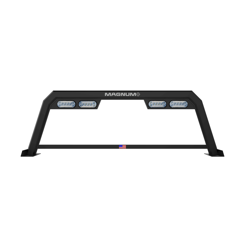 Headache Rack Pro High Vis Open Matte Black When you need a headache rack with halogen lights that delivers serious performance combined with exceptional visibility, the High Pro High Visibility Truck Rack delivers. Combining the best qualities of the Low Pro's style and halogen lights with the higher clearance of the Standard Truck Rack, you'll find a rugged design with a great powder coat finish and tonneau cover functionality that you won't find in any other back rack. The open design provides a wide angle of view often missing in other headache racks with halogen lights and is fully compatible with our Glide Track System accessories. Strong, all-aluminum welded design.Built for work and play the High Pro Truck Rack comes equipped with our Glide Track System and is compatible with our full line of truck accessories. Any job, any cargo, anytime!All truck racks include complete installation hardware kits (including a set of stake pocket tie downs where applicable). Designed for maximum visibility in a headache rack, Magnum's High Pro High Visibility truck rack protects while allowing great visibility out the back window Available in 3 finishes.