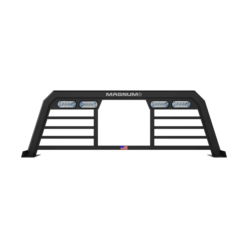 Headache Rack High Pro Window Bars Matte Black When your day demands more out of your truck, the High Pro Truck Rack delivers. Inspired by our Standard and Low Pro back racks, this headache rack gives you a durable matte black powder coat finish and bright LED lights along with a window cutout that provides better access. Fully compatible with all of our Glide Track System accessories, this rack gives you the clearance of the Standard rack with the added functionality you'll find in the Low Pro. As a Magnum truck rack, you'll get tough, lightweight durability with an exceptional fit. This headache rack is great for contractors who want a modern rugged design and complete functionality while on the job site.Built for work and play the High Pro Truck Rack comes equipped with our Glide Track System and is compatible with our full line of truck accessories. Any job, any cargo, anytime! The High Pro Rack is the lightest, toughest, and best-looking rack in its class.All truck racks include complete installation hardware kits (including a set of stake pocket tie downs where applicable). This headache rack by Magnum has a window cutout in the middle It is available in a variety of back styles like bars, mesh, and honeycomb Available in 3 finishes.