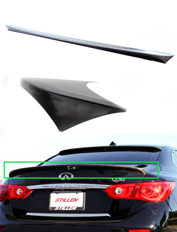 Infiniti Q50 Rear Spoiler - Trunk Lid - Not Painted The STILLEN Q50 Rear Spoiler mounts on the trunk decklid, and is sometimes called a rear decklid wing. The Q50's contours flow in a very organic manner, resulting in a rather curvaceous body. The tail end of the car somehow lacks something visually, though. To give the rear end a more streamlined, finished appearance, care is taken to manage air flow as well as to blend the lines of each part with the vehicle.