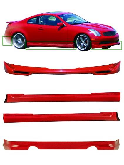 2003-2007 Infiniti G35 Coupe 4-Piece Body Kit - 103611KTL Get the custom look you have been craving with the STILLEN 103611KTL 4 piece body kit for Infiniti G35 Coupe! Like our other STILLEN body kits, this kit utilizes our years of experience on the track to develop a kit that looks good and is performance minded. This G35 body kit comes with a STILLEN Front Lip Spoiler, a STILLEN Rear Valance and two STILLEN Side Skirts - one for the vehicle's driver side and one for the passenger side.